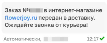 4. После сборки, вы получите фотографию готового букета, а так же вам придет сервисное сообщение когда ваш букет будет передан курьеру: