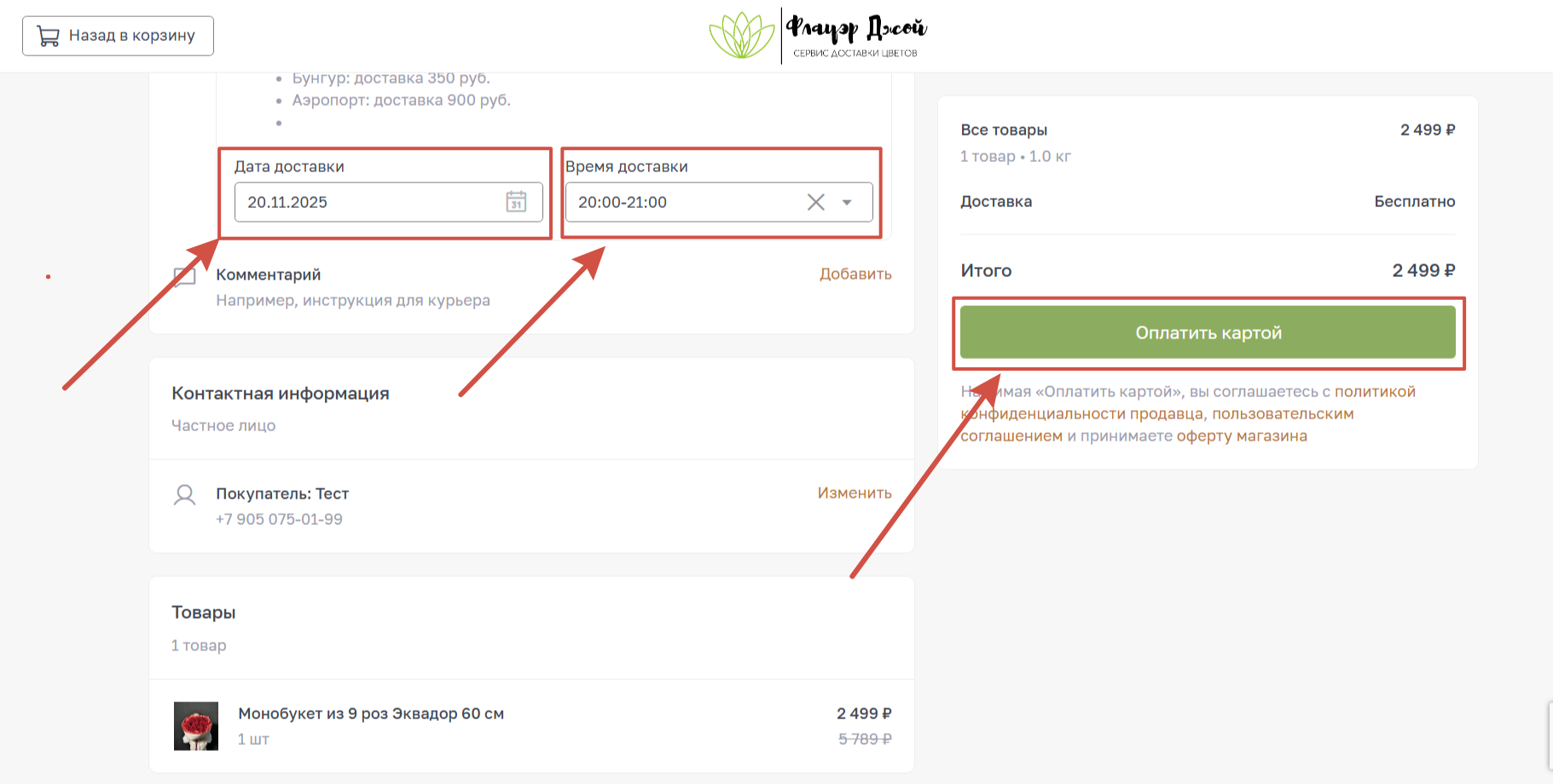 7. Выберите доступную дату и время для доставки цветов курьером. Подтвердите данные кнопкой " Привезти сюда"