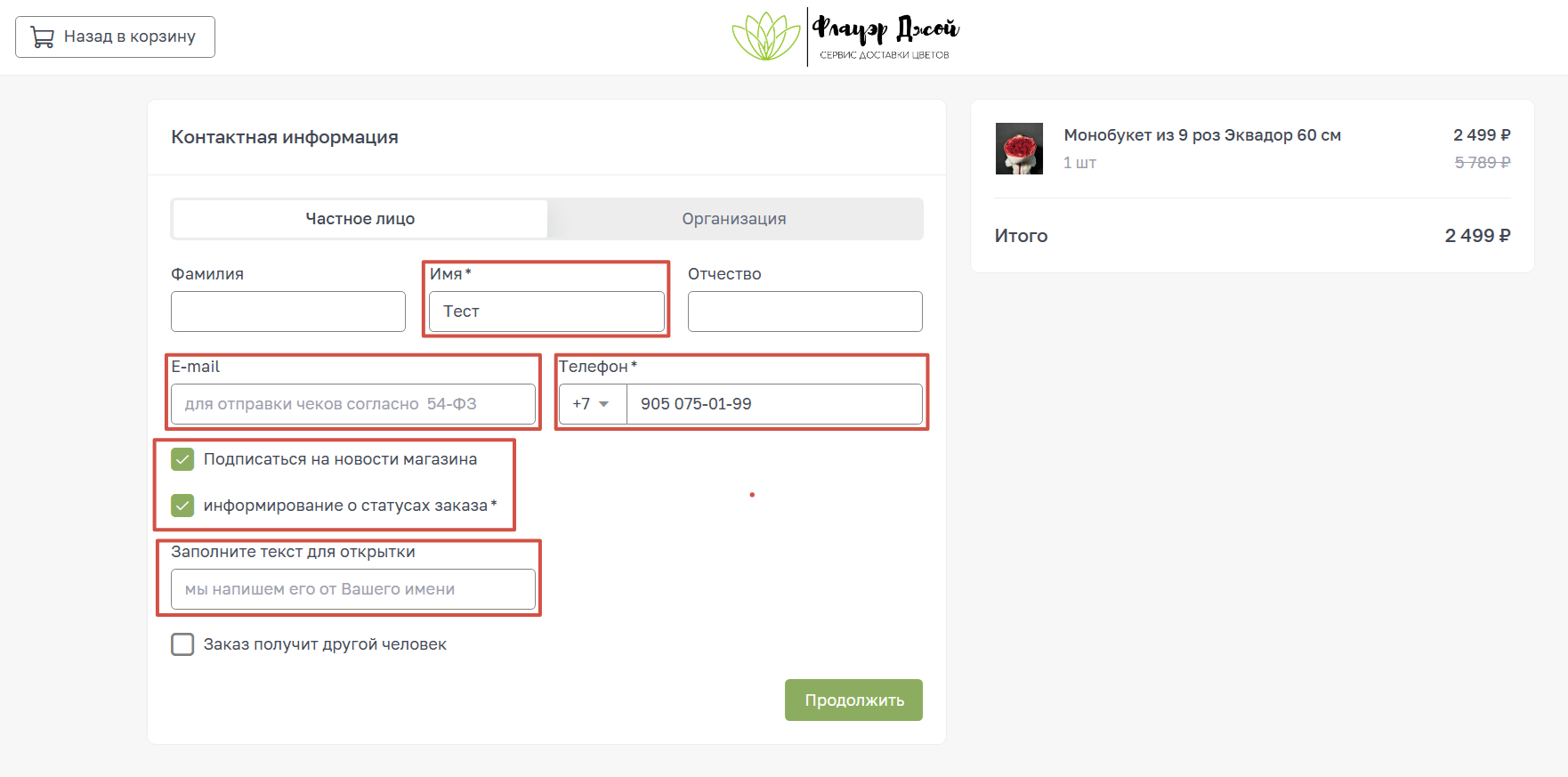 6. На странице выбора адреса для доставки, так же заполните все необходимые поля. Выбрать адрес для доставки цветов можно в том числе и на интерактивной карте. Стоимость доставки курьером отобразится автоматически.