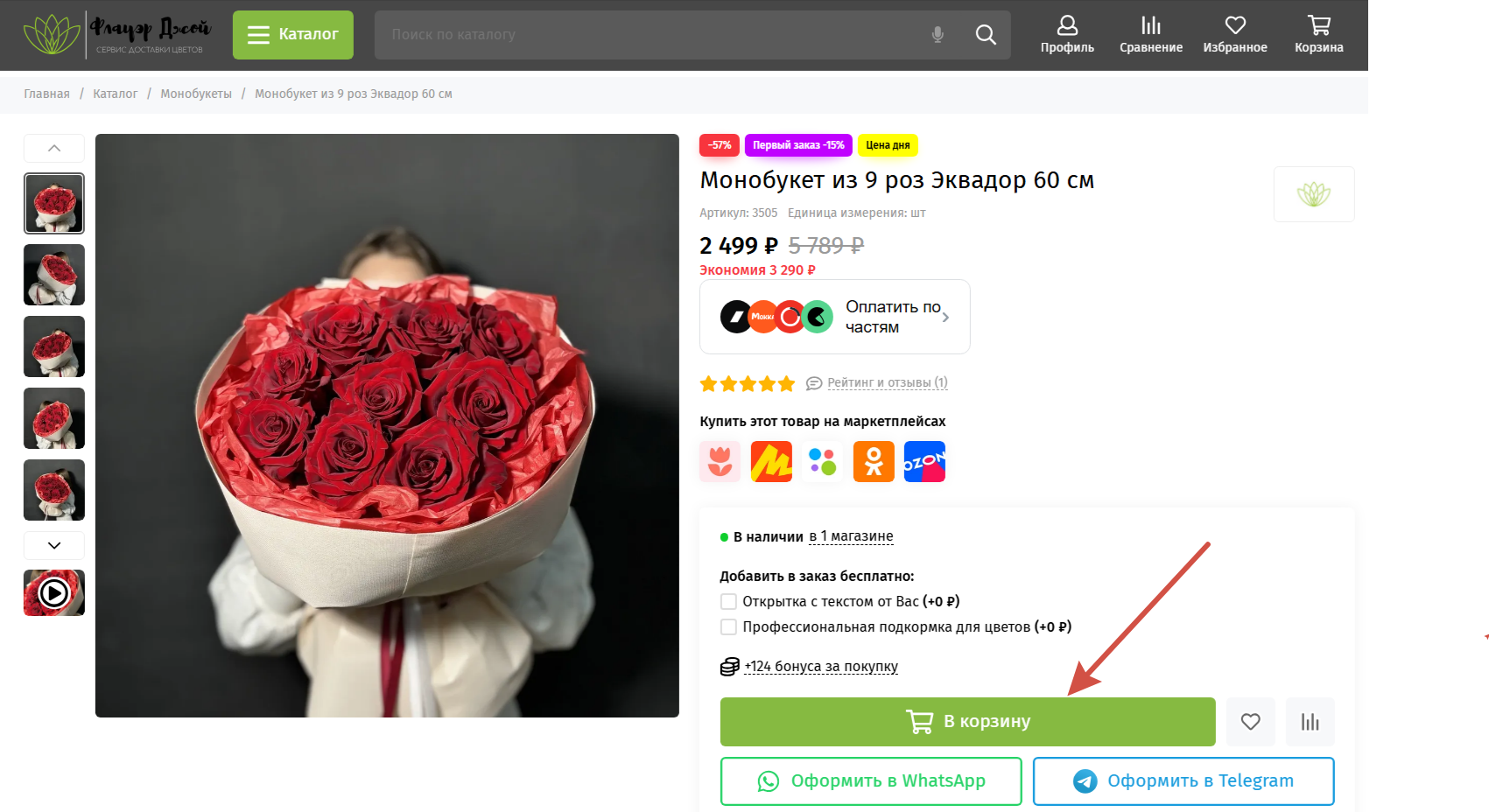 3. Выберите цветы или букет, который вам нравится и нажмите кнопку "В корзину".