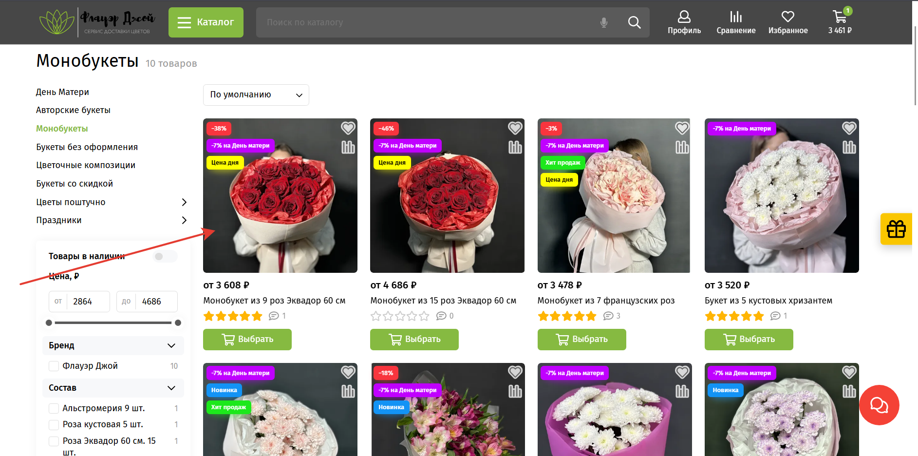 - Для того чтобы купить букет, выберите раздел Каталога.