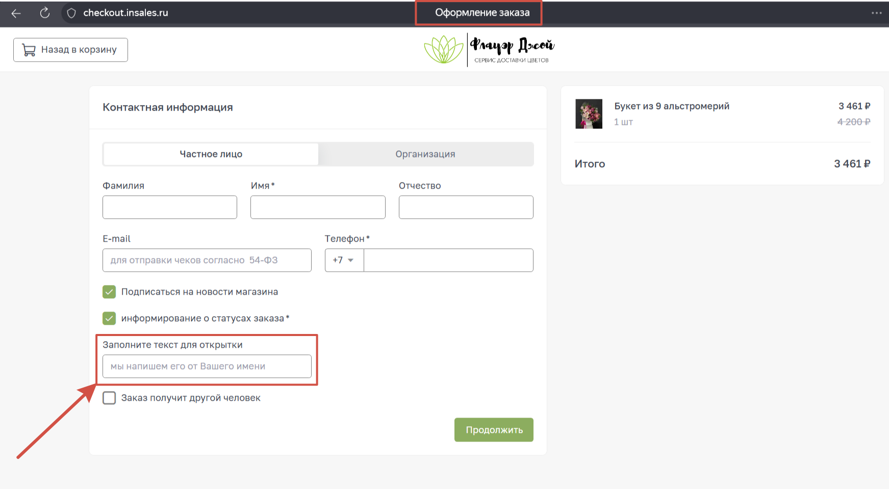 Текст для открытки можно указать при оформлении заказа в специальном поле.