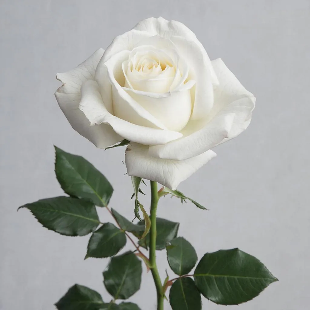 На изображении — свежесрезанная роза сорта Athena с плантации Baraka Roses. Бутон крупный, идеальной формы, лепестки белоснежные, без дефектов. Стебель длинный и мощный, листья насыщенно-зелёные, что подчёркивает премиальное качество эквадорских роз.